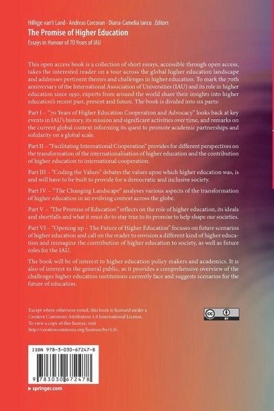 This book is a collection of short essays, accessible through open access, which takes the interested reader on a tour across the global higher education landscape. It addresses pertinent themes and challenges in higher education. To mark the 70th anniversary of the International Association of Universities (IAU) and its role in higher education since 1950, experts from around the world share their insights into higher education's recent past, present and future. The book is divided into six parts: