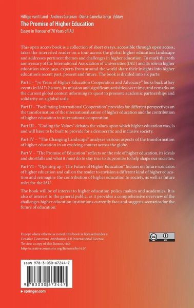 This book is a collection of short essays, accessible through open access, which takes the interested reader on a tour across the global higher education landscape. It addresses pertinent themes and challenges in higher education. To mark the 70th anniversary of the International Association of Universities (IAU) and its role in higher education since 1950, experts from around the world share their insights into higher education's recent past, present and future. The book is divided into six parts: