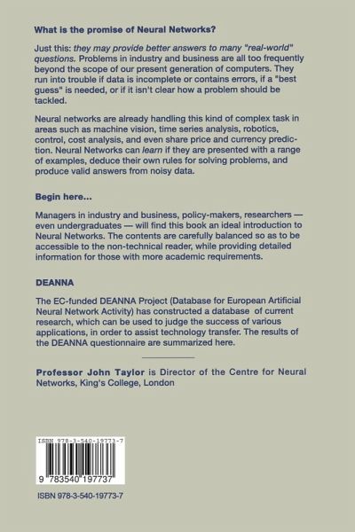 This book is the product of a 15-month intensive investigation of the European artificial network scene, together with a view of the broader framework of the subject in a world context. It could not have been completed in such a remarkably short time, and so effectively, without the dedicated efforts of Louise Turner, the DEANNA secretary, and Geoff Chappell, the DEANNA researcher, at the Centre for Neural Networks, King's College, London. I would like to take this opportunity to thank them for their heroic efforts. I would also like to thank my colleagues in the Centre and in the Mathematics Department, especially Mark Plumbley, Michael Reiss and Trevor Clarkson for all their help and encouragement, Denise Gorse of University College London, for allowing use of her lecture notes as a basis for the tutorial and the DEANNA partners for the part they played. Finally I would like to acknowledge the European Community support, and especially Mike Coyle for his trenchant comments during the carrying out of the work. March 1993 J. G. Taylor CONTENTS PART I: SETTING THE SCENE Chapter 1: DEANNA. . . . . . . . . . . . . . . . . . . . . . . . . . . . . . . . . . . . . . . . . . . . . . . . . . . . . . . . . . . . . . . . . . . . . . 3 1 . 1 Introduction. . . . . . . . . . . . . . . . . . . . . . . . . . . . . . . . . . . . . . . . . . . . . . . . . . . . . . . . . . . . . . . . . . . . . . . . . . . . 3 . 2 The Geographical Dimension. . . . . . . . . . . . . . . . . . . . . . . . . . . . . . . . . . . . . . . . . . . . . . . . . . 5 1 1. 3 The Industrial Dimension. . . . . . . . . . . . . . . . . . . . . . . . . . . . . . . . . . . . . . . . . . . . . . . . . . . . . . . . . 6 1 . 4 The Plan for Neural Networks . . . . . . . . . . . . . . . . . . . . . . . . . . . . . . . . . . .. . . . . . . . . . . . . . 6 Chapter 2: Neural Net Demonstrators. . . . . . . . . . . . . . . . . . . . . . . . . . . . . . . . . . . . . . . . . . 9 2. 1 The Status of Neural Networks . .. . . . . . . . . . . . . . . . . . . . . . . . . . . . . . . . . . . . . . . . . . . . . 9 2. 2 Reasons for the Employment of Neural Networks . . . . . . . . . . . . . . . . . . . 9 2. 3 Neural Network Models . . . . . . . . . . . . . . . . . . . . . . . . . . . . . . . . . . . . . . . . . . . . . . . . . . . . . . . . . . 10 2. 4 Areas of Application . . . . . . . . . . . . . . . . . . . . . . . . . . . . . . . . . . . . . . . . . . . . . . . . . . . . . . . . . . . . . . . . 11 2. 5 Typical Applications . . . . . . . . . . . . . . . . . . . . . . . . . . . . . . . . . . . . . . . . . . . . . . . . . . . . . . . . . . . . . . . .