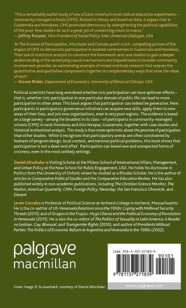 'In 'The Promise of Participation,' Altschuler and Corrales paint a rich, compelling picture of the impact of community managed schools on democratic participation in isolated communities in Guatemala and Honduras. Their use of statistical analysis to construct the framework and case studies to gain a deeper understanding of the underlying causal mechanisms and impediments to broader community involvement provides an outstanding example of mixed-methods research that weaves the quantitative and qualitative components together in complementary ways that raise the value of each.'