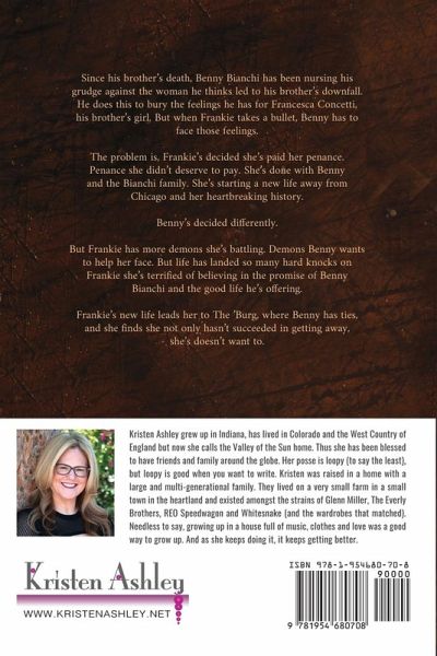 Since his brother's death, Benny Bianchi has been nursing his grudge against the woman he thinks led to his brother's downfall. He does this to bury the feelings he has for Francesca Concetti, his brother's girl. But when Frankie takes a bullet, Benny has to face those feelings. The problem is, Frankie's decided she's paid her penance. Penance she didn't deserve to pay. She's done with Benny and the Bianchi family. She's starting a new life away from Chicago and her heartbreaking history. Benny's decided differently. But Frankie has more demons she's battling. Demons Benny wants to help her face. But life has landed so many hard knocks on Frankie she's terrified of believing in the promise of Benny Bianchi and the good life he's offering. Frankie's new life leads her to The 'Burg, where Benny has ties, and she finds she not only hasn't succeeded in getting away, she's doesn't want to.