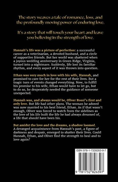 The story weaves a tale of romance, loss, and the profoundly moving power of enduring love. It's a story that will touch your heart and leave you believing in the strength of love. Hannah's life was a picture of perfection: a successful career as a veterinarian, a devoted husband, and a circle of supportive friends. But her world was shattered when a joyous wedding anniversary in Green Ridge, Virginia, turned into a nightmare. Suddenly, life lost its familiar rhythm, and every aspect of it was thrown into question. Ethan was very much in love with his wife, Hannah, and promised to care for her for the rest of their lives. But a tragic turn of events changed everything. Now, to fulfill his promise to his wife, Ethan would have to let go, but to do so, he desperately needed the guidance of someone unexpected. Hannah was, and always would be, Oliver Rossi's first and only love. But life had other plans. The woman he adored was now married to his best friend, Ethan. As if that wasn't enough, Oliver was forced to watch from the sidelines as the love of his life built the life he had always dreamed of, a life that should have been his. But amidst the love and the dreams, a shadow loomed. A deranged acquaintance from Hannah's past, a figure of darkness and despair, emerged to shatter their lives. Could Hannah, Ethan, and Oliver find the strength to heal and to love again?