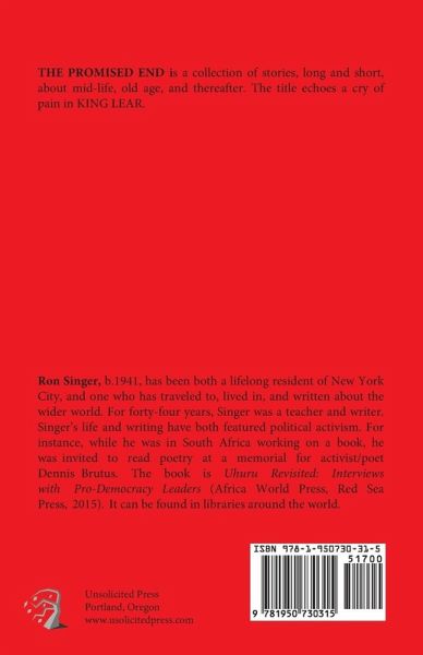 THE PROMISED END is a collection of stories, long and short, about mid-life, old age, and thereafter. The title echoes a cry of pain in KING LEAR. In Singer's vision, pain is both ubiquitous and funny. To compare his protagonists to characters from LEAR, some are like the suffering old men, Lear and Gloucester; others, closer to the whimsical Fool; some, witty villains, like the bastard, Edmund; and still others, hybrids. Each of the three stages features its own eccentricities and predicaments. Experiencing a mid-life crisis, for example, is a vacationing New Yorker who has sex with a teenager at a dump in Maine. An elderly man travels to a fictional African country, where he encounters two of his building's former superintendents, a political dissident and a gun runner. After death, a character whose avocation was shopping is reincarnated as a highway advertising display. To introduce one of these unfortunates, "Mr. Peavis was a fussy eater. Everything had to be just so, or he simply could not eat. Furthermore, his fussiness was of an unusual type: each meal of the week had to be a different color. On Wednesday nights, for instance, he had his red supper, which might consist of tomato soup, red meat, cabbage (red), watermelon, and red wine. What is more, the table service had to be the same color as the food: red plastic cutlery, plates and cups; red paper napkins and tablecloth. Ketchup was the condiment on Wednesday night -no mustard or mayonnaise."