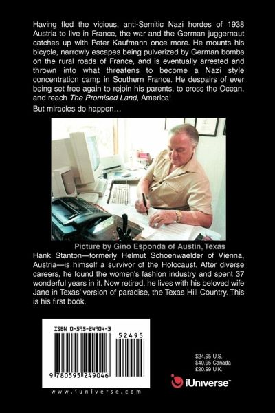 Having fled the vicious, ant-Semitic Nazi hordes of 1938 Austria to live in France, the war and the German juggernaut catches up with Peter Kaufmann once more. He mounts his bicycle, narrowly escapes being pulverized by German bombs on the rural roads of France, and is eventually arrested and thrown into what threatens to become a Nazi style concentration camp in Southern France. He despairs of ever being set free again to rejoin his parents and go to The Promised Land, America!