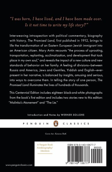 Weaving introspection with political commentary, biography with history, The Promised Land, first published in 1912, brings to life the transformation of an Eastern European Jewish immigrant into an American citizen. Mary Antin recounts "the process of uprooting, transportation, replanting, acclimatization, and development that took place in [her] own soul" and reveals the impact of a new culture and new standards of behavior on her family. A feeling of division between Russia and America, Jews and Gentiles, Yiddish and English ever-present in her narrative is balanced by insights, amusing and serious, into ways to overcome it. In telling the story of one person, The Promised Land illuminates the lives of hundreds of thousands.