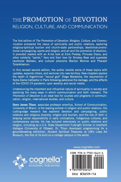 The first edition of The Promotion of Devotion: Religion, Culture, and Communication pioneered the nexus of spirituality and public relations, exploring religious-spiritual tourism and church-state partnerships; devotional-promotional campaigning; sports and religion; and art and the promotion of devotion. It provided readers with an A-list look at Elvis Presley, Princess Diana, and other celebrity "saints," fans and their love for Smokey Bear and superstar racehorse Barbaro, and cultural phenoms Marilyn Monroe and Pharaoh Tutankhamun. In this revised second edition, the author revisits some of these topics with updates, expands others, and ventures into new territory. New chapters explore the death of Argentinian "soccer god" Diego Maradona, the resurrection of Notre Dame Cathedral in Paris following extensive fire damage, and the effects of the COVID-19 pandemic upon worship and social media. Underscoring the important and influential nature of spirituality in society and exploring the many ways in which communication and faith intersect, The Promotion of Devotion is an ideal text for courses and programs in communication, religion, international studies, and culture.