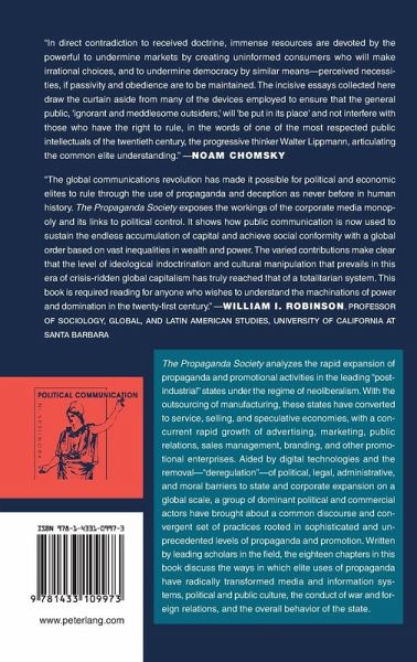 Contents: Graham Murdock: Preface - Gerald Sussman: Introduction: The Propaganda Society - Robert W. McChesney/Inger L. Stole/John Bellamy Foster/Hannah Holleman: Advertising and the Genius of Commercial Propaganda - Doris Baltruschat: Branded Entertainment and the New Media Economy - Matthew P. McAllister: «Very High Art»: The Cultural Enhancement of Product Promotion in «Making-of» Videos about Advertising Campaigns - Tim Dwyer: Net Worth: Popular Social Networks as Colossal Marketing Machines - Massimo Ragnedda/Glenn W. Muschert: The Regime of Propaganda in a Neoliberal State: Berlusconi and the Italian Media - Sharon Beder: Corporate Discourse on Climate Change - Inger L. Stole: Cause Marketing as Commercial Propaganda: Neoliberal Wolf in Sheep's Clothing? - Michael Barker: Celebrity Philanthropy: In the Service of Corporate Propaganda - Robert Jensen: Pornography as Propaganda - Douglas Kellner: War Correspondents, the Military, and Propaganda: Some Critical Reflections - Edward Herman/David Peterson: Legitimizing Versus Delegitimizing Elections: Honduras and Iran - Lee Artz: The New Rhetoric of the Global War on Terrorism - Sue Curry Jansen: International Public Relations: Neoliberal Fixer and Diplomat Without Portfolio - Aeron Davis: Promotion, Propaganda, and High Finance - James F. Tracy: Covering Workers: News Media, Labor, and the 2008 Economic Crisis - Dominic Wring: Telling It Like It Is: The Focus Group as an Ideological Weapon - Patricia Mazepa: Direct from the Source: Canada's Integrated System of State Propaganda - Gerald Sussman: Epilogue.