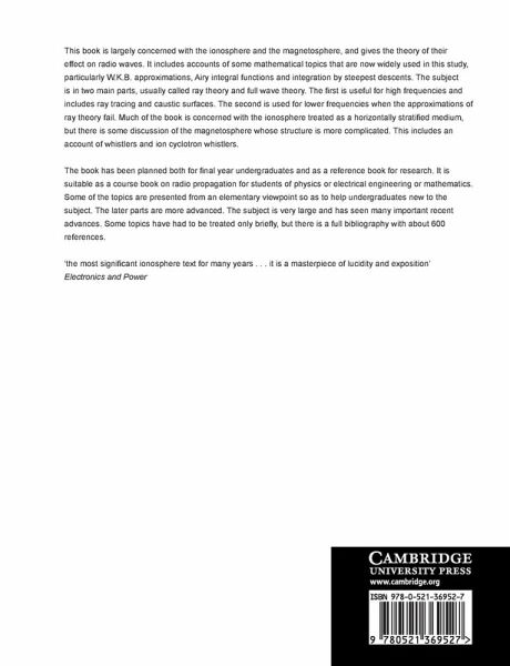 This book is largely concerned with the ionosphere and the magnetosphere, and gives the theory of their effect on radio waves. It includes accounts of some mathematical topics that are now widely used in this study, particularly W.K.B. approximations, Airy integral functions and integration by steepest descents. The subject is in two main parts, usually called ray theory and full wave theory. The first is useful for high frequencies and includes ray tracing and caustic surfaces. The second is used for lower frequencies when the approximations of ray theory fail. Much of the book is concerned with the ionosphere treated as a horizontally stratified medium, but there is some discussion of the magnetosphere whose structure is more complicated. This includes an account of whistlers and ion cyclotron whistlers. The book has been planned both for final year undergraduates and as a reference book for research. It is suitable as a course book on radio propagation for students of physics or electrical engineering or mathematics. Some of the topics are presented from an elementary viewpoint so as to help undergraduates new to the subject. The later parts are more advanced. The subject is very large and has seen many important recent advances. Some topics have had to be treated only briefly, but there is a full bibliography with about 600 references.