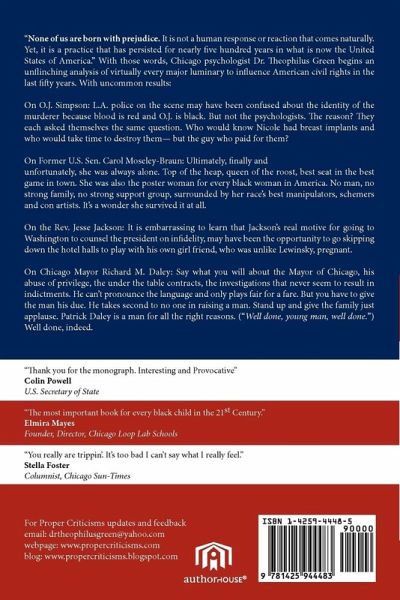 The Proper Criticism of Some Decent People A Candid, Unblinking, Unapologetic, Uncompromising Look at the Leadership Crisis in Black America and the Impact on the Leadership of America By Dr. Theophilus Green _____________________________________________ "None of us are born with prejudice. It is not a human response or reaction that comes naturally. Yet, it is a practice that has persisted for nearly five hundred years in what is now the United States of America." With those words, Chicago psychologist Dr. Theophilus Green begins an unflinching analysis of virtually every major luminary to influence American civil rights in the last fifty years. With uncommon results: On O.J. Simpson: L.A. police on the scene may have been confused about the identity of the murderer because blood is red and O.J. is black. But not the psychologists. The reason? They each asked themselves the same question. Who would know Nicole had breast implants, and who would take time to destroy them,-but the guy who paid for them? On Black women: The fully Americanized black woman is a willful, dominating, colorful, controlling, unique mixture of female. You should read that as a compliment, not an editorial. You should also consider it fair warning. On Former U.S. Sen. Carol Moseley-Braun: Ultimately, finally and unfortunately, Sen. Carol Moseley-Braun was always alone. Top the heap, queen of the roost, best seat in the best game in town. She was also the poster woman for every black woman in America. No man, no strong family, no strong support group, surrounded by manipulators, schemers and cons. It's a wonder she survived it at all. On Rev. Jesse Jackson: It is embarrassing to later discover that Rev. Jackson's real motive for going to Washington to counsel the President may have been the opportunity to go skipping down the hotel halls to play with his own girlfriend, who was unlike Lewinsky, pregnant. On Chicago Mayor Richard M. Daley: Say what you want about the Mayor of Chicago, his abuse of privilege, the under the table contracts, the investigations that never seem to result in indictments. He can't pronounce the language and only plays fair for a fare. But you have to give the man his due. He takes second to no one in raising a man. Stand up and give the family just applause. His son Patrick Daley is a man for all the right reasons. ("Well done, young man, well done.") Well done, indeed. "Thank you for the monograph. Interesting and Provocative" Colin Powell U.S. Secretary of State "The most important book for every black child in the 21st century." Elmira Mayes, Founder, Director, Loop Lab School "I never thought I would ever read a book that would admit that the Catholic church celibacy hypocrisy breeds pedophiles." Robert Knight, Chairman, Committee to Seek Redress Justice for Children of Catholic Clergy Sexual Abuse