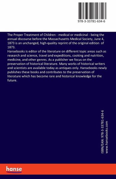 The Proper Treatment of Children - medical or medicinal - being the annual discourse before the Massachusetts Medical Society, June 4, 1873 is an unchanged, high-quality reprint of the original edition of 1873. Hansebooks is editor of the literature on different topic areas such as research and science, travel and expeditions, cooking and nutrition, medicine, and other genres. As a publisher we focus on the preservation of historical literature. Many works of historical writers and scientists are available today as antiques only. Hansebooks newly publishes these books and contributes to the preservation of literature which has become rare and historical knowledge for the future.