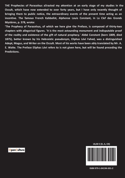 The Prophecies of Paracelsus attracted my attention at an early stage of my studies in the Occult, which have now extended to over forty years, but I have only recently thought of bringing them to public notice, the extraordinary events of the present time acting as an incentive. The famous French Kabbalist, Alphonse Louis Constant, in La Clef des Grands Mystères, p. 378, wrote: 'The Prophecy of Paracelsus, of which we here give the Preface, is composed of thirty-two chapters with allegorical figures. 'It is the most astounding monument and indisputable proof of the reality and existence of the gift of natural prophecy.' Abbé Constant (born 1809, died 1875), better known by his Hebraistic pseudonym, Eliphas Lévi Fahed, was a distinguished Adept, Magus, and Writer on the Occult. Most of his works have been ably translated by Mr. A. E. Waite. The Preface Eliphas Lévi refers to is not given here, but will be found preceding the Predictions.
