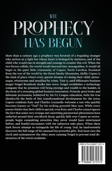 More than a century ago a prophecy was foretold of a beguiling stranger who arrives as a light but whose heart is besieged by darkness, and of the child who would rise in strength and courage to counter this evil. When the two forces collide, the world would descend into Armageddon. It would all begin in the quiet little community of Capers, North Carolina. Insulated from the rest of the world by the Great Smoky Mountains, idyllic Capers is the kind of place where every parent dreams of raising their child: picturesque, wholesome and unsullied by crime. That is, until billionaire business mogul Noigel Braddock skulks into town. Noigel establishes a technology company that he promises will bring prestige and wealth to the hamlet, in the form of a sweeping global business innovation. Princely good looks and debonair persuasion, bolstered by his Ivy League education, belie his true identity. On the heels of this transformational development for the town, Capers residents Katy and Charles Leonardis welcome a son who quickly becomes known as "Teal" for his striking greenish-blue eyes. While every parent thinks that their child is special, even Katy and Charles cannot ignore the fact that some very strange and unsettling paranormal phenomena have unfurled around their son. Moral decay quickly falls over Capers as townspeople begin committing atrocities they never would have entertained before, and fearful encounters with the unknown take place. When these dark forces attempt to extinguish the life of young Teal, he inadvertently discovers the full range of his unusual but powerful gifts. Teal must race the clock and outmaneuver the older, more cunning Noigel to prevent total destruction of the town's residents.