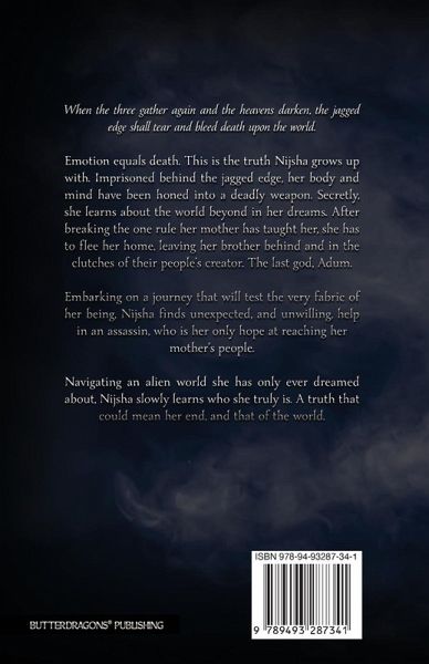 The Eric Hoffer Award 2024 Finalist When the three gather again and the heavens darken, the jagged edge shall tear and bleed death upon the world.¿ Emotion equals death. This is the truth Nijsha grows up with. Imprisoned behind the jagged edge, her body and mind have been honed into a deadly weapon. Secretly, she learns about the world beyond in her dreams. After breaking the one rule her mother has taught her, she has to flee her home, leaving her brother behind and in the clutches of their people's creator. The last god, Adum. Embarking on a journey that will test the very fabric of her being, Nijsha finds unexpected, and unwilling, help in an assassin, who is her only hope at reaching her mother's people. Navigating an alien world she has only ever dreamed about, Nijsha slowly learns who she truly is. A truth that could mean her end, and that of the world.