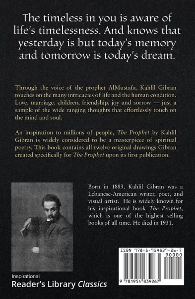 The timeless in you is aware of life's timelessness. And knows that yesterday is but today's memory and tomorrow is today's dream. Through the voice of the prophet AlMustafa, Kahlil Gibran touches on the many intricacies of life and the human condition. Love, marriage, children, friendship, joy and sorrow - just a sample of the wide ranging thoughts that effortlessly touch on the mind and soul. An inspiration to millions of people, The Prophet by Kahlil Gibran is widely considered to be a masterpiece of spiritual poetry. This book contains all twelve original drawings Gibran created specifically for The Prophet upon its first publication.