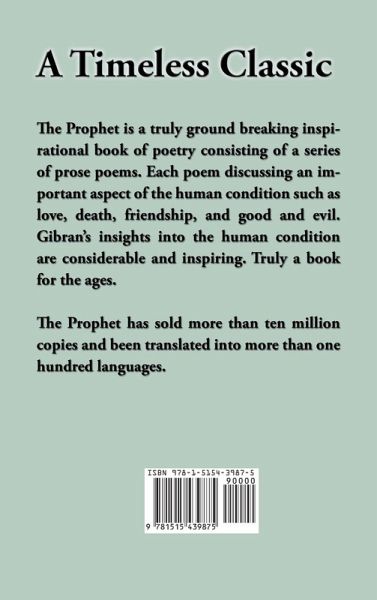 The Prophet is a truly ground breaking inspirational book of poetry consisting of a series of prose poems. Each poem discussing an important aspect of the human condition such as love, death, friendship, and good and evil. Gibran's insights into the human condition are considerable and inspiring. Truly a book for the ages. The Prophet has sold more than ten million copies and been translated into more than one hundred languages.