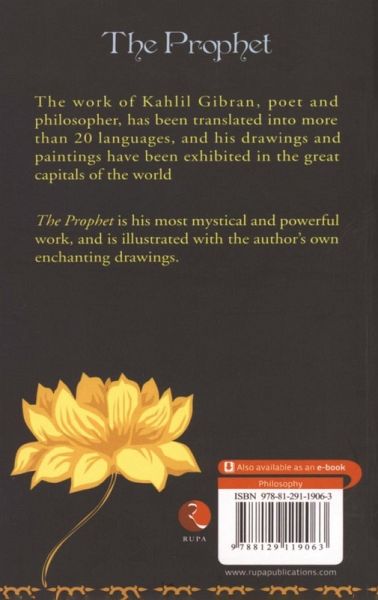 The work of the great Kahlil Gibran, the poet and philosopher, has been translated into more than twenty languages. The Prophet, his most mystical and powerful work, is a collection of essays in prose as well as poetry, exploring the meaning of life and the condition of man. Illustrated with the author's own drawings, it was first published in 1923 and has never been out of print.
