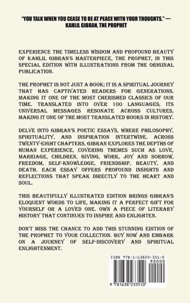 "You talk when you cease to be at peace with your thoughts." ¿ Kahlil Gibran, The Prophet Experience the timeless wisdom and profound beauty of Kahlil Gibran's masterpiece, The Prophet, in this special edition with illustrations from the original publication. The Prophet is not just a book; it is a spiritual journey that has captivated readers for generations, making it one of the most cherished classics of our time. Translated into over 100 languages, its universal messages resonate across cultures, making it one of the most translated books in history. Delve into Gibran's poetic essays, where philosophy, spirituality, and inspiration intertwine. Across twenty-eight chapters, Gibran explores the depths of human experience, covering themes such as love, marriage, children, giving, work, joy and sorrow, freedom, self-knowledge, friendship, beauty, and death. Each essay offers profound insights and reflections that speak directly to the heart and soul. This beautifully illustrated edition brings Gibran's eloquent words to life, making it a perfect gift for yourself or a loved one. Own a piece of literary history that continues to inspire and enlighten. Don't miss the chance to add this stunning edition of The Prophet to your collection. Buy now and embark on a journey of self-discovery and spiritual enlightenment.