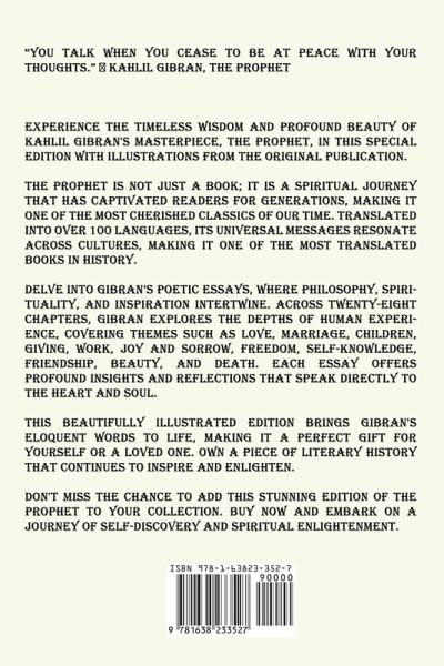 "You talk when you cease to be at peace with your thoughts." ¿ Kahlil Gibran, The Prophet Experience the timeless wisdom and profound beauty of Kahlil Gibran's masterpiece, The Prophet, in this special edition with illustrations from the original publication. The Prophet is not just a book; it is a spiritual journey that has captivated readers for generations, making it one of the most cherished classics of our time. Translated into over 100 languages, its universal messages resonate across cultures, making it one of the most translated books in history. Delve into Gibran's poetic essays, where philosophy, spirituality, and inspiration intertwine. Across twenty-eight chapters, Gibran explores the depths of human experience, covering themes such as love, marriage, children, giving, work, joy and sorrow, freedom, self-knowledge, friendship, beauty, and death. Each essay offers profound insights and reflections that speak directly to the heart and soul. This beautifully illustrated edition brings Gibran's eloquent words to life, making it a perfect gift for yourself or a loved one. Own a piece of literary history that continues to inspire and enlighten. Don't miss the chance to add this stunning edition of The Prophet to your collection. Buy now and embark on a journey of self-discovery and spiritual enlightenment.