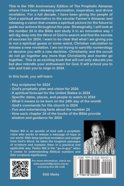 This is the 10th Anniversary Edition of The Prophetic Almanac where I have been releasing information, inspiration, and divine revelation. For a full decade, I have been giving the people of God a spiritual alternative to the secular Farmer's Almanac and releasing a vision that creates a spiritual picture for the future to guide our actions throughout the year. Strategically, I will look at the number 24 in the Bible and study it in an innovative way. I will dig deep into the Word of God to search and find the secrets of success for 2024. I want to be clear that what I am giving you is not a spiritual guess or some weird, Christian calculation to release a new revelation. I am not trying to sanctify numerology or deceive you with a new doctrine. Christianity and the occult do not go together any more than Christianity and murder go together. This is an exciting book that will not only educate you but also rekindle your enthusiasm for God. It will school you to rule and train you to reign in 2024. In this book, you will learn: - Key scriptures for 2024 - God's prophetic plan and vision for 2024 - A spiritual forecast for the United States in 2024 - Specific dates, places, and people to watch in 2024 - What it means to be born on the 24th day of the month - God's commands for His church in 2024 - Fun and entertaining facts about the number 24 - How each chapter 24 of the books of the Bible provide wisdom and guidance for 2024