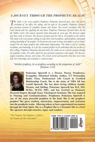 A JOURNEY THROUGH THE PROPHETIC REALM! This book is for every prophet! Prophetess Poinciana Sprewell gives clear and precise revelation of the office, the calling, and the gifts of the prophet. Prophetess Sprewell gives personal accounts of prophetic dreams and visions. She reveals revelations that The Lord shared with her regarding the end times. Prophetess Poinciana Sprewell blows the lid off hidden secrets. She exposes mysteries from thousands of years ago. She discusses angels and their rank in Heaven. She discusses protocol and the role of the prophet in the church. This book is for every pastor seeking to train their church prophets, called prophets, and people seeking knowledge of the prophet. To the person who wants to know do prophets exist in today’s society? For the major prophet who understands dispensation. This book is full of wisdom, revelation, and knowledge. It is for the seasoned prophet to the individual who has no idea of their calling. Prophetess Poinciana Sprewell takes the reader on an exclusive journey through the prophetic realm. She talks about her own personal experiences with angels. She discusses angelic visitations, dreams, and visions. She reveals secrets and mysteries that have never been told. Her knowledge and revelation is second to none! “whether prophecy, let us prophesy according to the proportion of faith” (Romans 12:6) Poinciana Sprewell is a Doctor, Pastor, Prophetess, Evangelist, Historical Scholar, Author, T.V Personality, Radio Host, Professional Life Coach & Certified Relationship Coach. She is the sister of NBA All Star Latrell Sprewell. She has three loving children Ayinde, Deonta, and Stirling. Poinciana Sprewell has B.A, MA, M.Div., M.TH, PRC, and has received an Honorary Doctoral Degree through Grace Theological Seminary. She has majored in Nursing and Communications. Prophetess Poinciana Sprewell is one of the most powerful prophets in the land. She is the prophet’s prophet! She gives wisdom, instruction, empowerment, and activation into the prophetic realm. Allowing others to have supernatural encounters through the Holy Spirit. She is a Prophet! She is a Dreamer! She is a Seer! She operates through miracles, signs, and wonders.