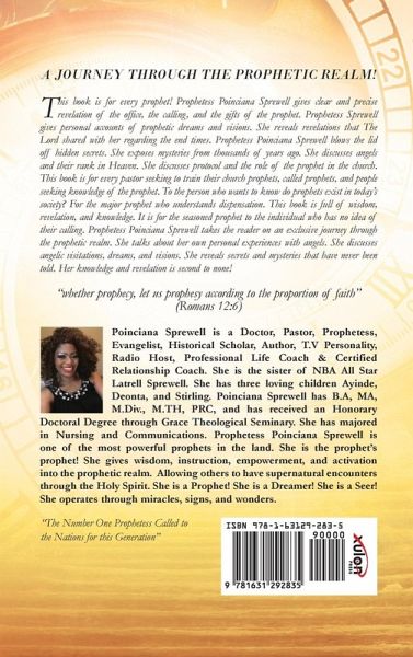 A JOURNEY THROUGH THE PROPHETIC REALM! This book is for every prophet! Prophetess Poinciana Sprewell gives clear and precise revelation of the office, the calling, and the gifts of the prophet. Prophetess Sprewell gives personal accounts of prophetic dreams and visions. She reveals revelations that The Lord shared with her regarding the end times. Prophetess Poinciana Sprewell blows the lid off hidden secrets. She exposes mysteries from thousands of years ago. She discusses angels and their rank in Heaven. She discusses protocol and the role of the prophet in the church. This book is for every pastor seeking to train their church prophets, called prophets, and people seeking knowledge of the prophet. To the person who wants to know do prophets exist in today’s society? For the major prophet who understands dispensation. This book is full of wisdom, revelation, and knowledge. It is for the seasoned prophet to the individual who has no idea of their calling. Prophetess Poinciana Sprewell takes the reader on an exclusive journey through the prophetic realm. She talks about her own personal experiences with angels. She discusses angelic visitations, dreams, and visions. She reveals secrets and mysteries that have never been told. Her knowledge and revelation is second to none! “whether prophecy, let us prophesy according to the proportion of faith” (Romans 12:6) Poinciana Sprewell is a Doctor, Pastor, Prophetess, Evangelist, Historical Scholar, Author, T.V Personality, Radio Host, Professional Life Coach & Certified Relationship Coach. She is the sister of NBA All Star Latrell Sprewell. She has three loving children Ayinde, Deonta, and Stirling. Poinciana Sprewell has B.A, MA, M.Div., M.TH, PRC, and has received an Honorary Doctoral Degree through Grace Theological Seminary. She has majored in Nursing and Communications. Prophetess Poinciana Sprewell is one of the most powerful prophets in the land. She is the prophet’s prophet! She gives wisdom, instruction, empowerment, and activation into the prophetic realm. Allowing others to have supernatural encounters through the Holy Spirit. She is a Prophet! She is a Dreamer! She is a Seer! She operates through miracles, signs, and wonders.