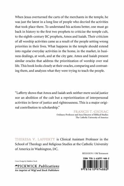 When Jesus overturned the carts of the merchants in the temple, he was just the latest in a long line of people who decried the activities that took place there. To understand his actions better, one must go back in history to the eighth century BCE, to the first two prophets to criticize the temple cult: Amos and Isaiah. Their criticism of all worship activities came as a result of the people setting wrong priorities in their lives. What happens in the temple should extend into regular everyday activities in the home, in the market, in business dealings, at work, and at the city gate. Amos and Isaiah present similar oracles that address the prioritization of worship over real life. This book looks closely at their oracles, comparing and contrasting them, and analyzes what they were trying to teach the people.