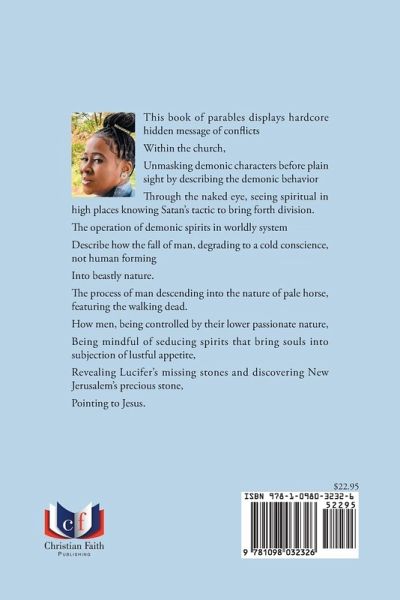 This book of parables displays hardcore hidden message of conflicts Within the church, Unmasking demonic characters before plain sight by describing the demonic behavior Through the naked eye, seeing spiritual in high places knowing Satan's tactic to bring forth division. The operation of demonic spirits in worldly system Describe how the fall of man, degrading to a cold conscience, not human forming Into beastly nature. The process of man descending into the nature of pale horse, featuring the walking dead. How men, being controlled by their lower passionate nature, Being mindful of seducing spirits that bring souls into subjection of lustful appetite, Revealing Lucifer's missing stones and discovering New Jerusalem's precious stone, Pointing to Jesus.