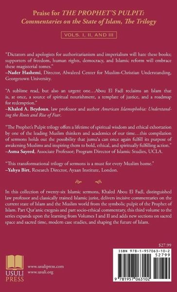 Praise for The Prophet's Pulpit: Commentaries on the State of Islam, The Trilogy "Dictators and apologists for authoritarianism and imperialism will hate these books; supporters of freedom, human rights, democracy, and Islamic reform will embrace these magisterial tomes." Nader Hashemi, Director, Alwaleed Center for Muslim-Christian Understanding, Georgetown University. "A sublime read, but also an urgent one...Abou El Fadl reclaims an Islam that is, at once, a source of spiritual nourishment, a template of justice, and a roadmap for redemption." Khaled A. Beydoun, law professor and author American Islamophobia: Understanding the Roots and Rise of Fear. "The Prophet's Pulpit trilogy offers a lifetime of spiritual wisdom and ethical exhortation by one of the leading Muslim thinkers and academics of our time...this compilation of sermons holds out the possibility that jumüa can once again fulfill its purpose of awakening Muslims and inspiring them to bold, ethical, and spiritually fulfilling action." Asma Sayeed, Associate Professor; Program Director of Islamic Studies, UCLA. "This transformational trilogy of sermons is a must for every Muslim home." Yahya Birt, Research Director, Ayaan Institute, London. In this collection of twenty-six Islamic sermons, Khaled Abou El Fadl, distinguished law professor and classically trained Islamic jurist, delivers incisive commentaries on the current state of Islam and the Muslim world from the symbolic pulpit of the Prophet of Islam. Part Qur'anic exegesis and part socio-ethical commentary, this third volume to the series expands upon the learning from Volumes I and II and adds new sections on sacred space and sacred time, modern case studies, and shaping the future of Islam.
