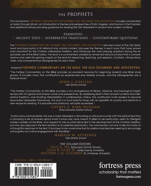 This concise commentary on the Prophets, excerpted from the Fortress Commentary on the Bible: The Old Testament and Apocrypha, engages readers in the work of biblical interpretation. Contributors from a rich diversity of perspectives connect historical-critical analysis with sensitivity to current theological, cultural, and interpretive issues. Each chapter (Isaiah through Malachi) includes an introduction and commentary based on three lenses: ancient context, the interpretative tradition, and contemporary questions and challenges. The Prophets introduces fresh perspectives and draws students, preachers, and interested readers into the challenging work of interpretation.