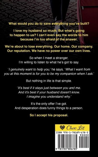What would you do to save everything you've built? I love my husband so much. But what's going to happen to us? I can't even say the words to him because I'm too afraid of the answer. We're about to lose everything. Our home. Our company. Our reputation. We have no power over our own lives. So when I meet a stranger, I'm willing to listen to what he's got to say. 'I genuinely want to help you,' he says, 'What I want from you at this moment is for you to be my companion when I ask.' But nothing in life is that simple. 'It's best if it stays just between you and me. And it's best if your husband doesn't know. I imagine you understand why.' It's the only offer I've got. And desperation does funny things to a person. So I accept his proposal. Perfect for fans of B.A. Paris, Valerie Keogh, Lisa Hall, Nicola Sanders Jane E. James or The Silent Patient. This book was previously published as When He Finds You.