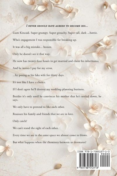 ¿ Amazon Top 60 Bestseller ¿ I never should have agreed to become his... Liam Kincaid. Super grumpy. Super grouchy. Super tall, dark ...hottie. Whose engagement I was responsible for breaking up. It was all a big mistake... honest. Only he doesn't see it that way. He now has to get married and claim his inheritance. And he insists I pay for my error, ...by posing as his fake wife. It's not like I have a choice. If I don't agree he'll destroy my wedding-planning business. Besides it's only until he convinces his mother that he's settled down. We only have to pretend to like each other. Reassure his family and friends that we are in love. Only catch? We can't stand the sight of each other. Every time we are in the same space we almost come to blows. But what happens when the chemistry between us detonates? Note: This is Liam and Isla's story. An Enemies to Lovers, Fake Marriage, Billionaire Romance stand alone featuring a hot possessive billionaire and the high spirited wedding planner who dares to clash with him. 1-Click NOW