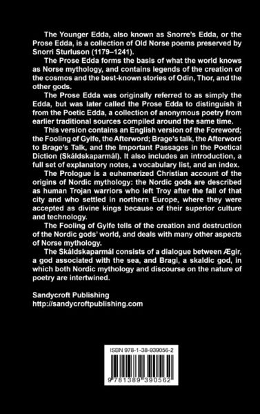 The Younger Edda, also known as Snorre's Edda, or the Prose Edda, is a collection of Old Norse poems preserved by Snorri Sturluson (1179-1241). The Prose Edda forms the basis of what the world knows as Norse mythology, and contains legends of the creation of the cosmos and the best-known stories of Odin, Thor, and the other gods. The Prose Edda was originally referred to as simply the Edda, but was later called the Prose Edda to distinguish it from the Poetic Edda, a collection of anonymous poetry from earlier traditional sources compiled around the same time. This version contains an English version of the Foreword; the Fooling of Gylfe, the Afterword; Brage's talk, the Afterword to Brage's Talk, and the Important Passages in the Poetical Diction (Skáldskaparmál). It also includes an introduction, a full set of explanatory notes, a vocabulary list, and an index. The Prologue is a euhemerized Christian account of the origins of Nordic mythology: the Nordic gods are described as human Trojan warriors who left Troy after the fall of that city and who settled in northern Europe, where they were accepted as divine kings because of their superior culture and technology. The Fooling of Gylfe tells of the creation and destruction of the Nordic gods' world, and deals with many other aspects of Norse mythology. The Skáldskaparmál consists of a dialogue between Ægir, a god associated with the sea, and Bragi, a skaldic god, in which both Nordic mythology and discourse on the nature of poetry are intertwined.