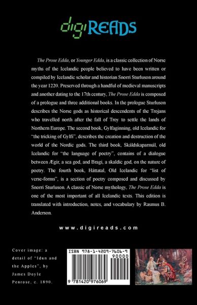 "The Prose Edda", or "Younger Edda", is a classic collection of Norse myths of the Icelandic people believed to have been written or compiled by Icelandic scholar and historian Snorri Sturluson around the year 1220. Preserved through a handful of medieval manuscripts and another dating to the 17th century, "The Prose Edda" is composed of a prologue and three additional books. In the prologue Sturluson describes the Norse gods as historical descendents of the Trojans who travelled north after the fall of Troy to settle the lands of Northern Europe. The second book, Gylfaginning, old Icelandic for "the tricking of Gylfi", describes the creation and destruction of the world of the Nordic gods. The third book, Skáldskaparmál, old Icelandic for "the language of poetry", contains of a dialogue between Ægir, a sea god, and Bragi, a skaldic god, on the nature of poetry. The fourth book, Háttatal, Old Icelandic for "list of verse-forms", is a section of poetry composed and discussed by Snorri Sturluson. A classic of Norse mythology, "The Prose Edda" is one of the most important of all Icelandic texts. This edition is printed on premium acid-free paper and is translated with introduction, notes, and vocabulary by Rasmus B. Anderson.
