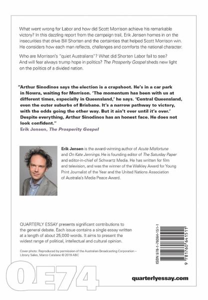 A dazzling and insightful look at the Australian federal election 2019. What went wrong for Labor and how did Scott Morrison achieve his remarkable victory? In this dazzling report from the campaign trail, Erik Jensen homes in on the insecurities that drive Bill Shorten and the certainties that helped Scott Morrison win. He considers how each man reflects, challenges and comforts the national character. Who are Morrison's "quiet Australians"? What did Shorten Labor fail to see? And will fear always trump hope in politics? The Prosperity Gospel sheds new light on the politics of a divided nation. "Arthur Sinodinos says the election is a crapshoot. He's in a car park in Nowra, waiting for Morrison. 'The momentum has been with us at different times, especially in Queensland,' he says. 'Central Queensland, even the outer suburbs of Brisbane. It's a narrow pathway to victory, with the odds going the other way. But it ain't over until it's over.' Despite everything, Arthur Sinodinos has an honest face. He does not look confident." -Erik Jensen, The Prosperity Gospel This issue also contains correspondence discussing Quarterly Essay 73, Australia Fair, from Susan Carland, James Walter, Carol Johnson, Travers McLeod, Isabelle Reinecke, and Rebecca Huntley