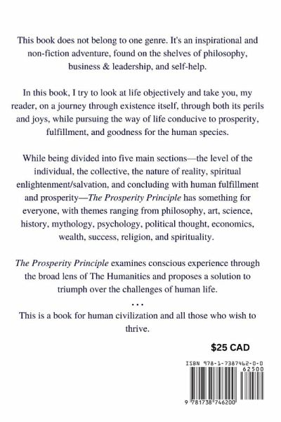 This book does not belong to one genre. It's an inspirational and non-fiction adventure, found on the shelves of philosophy, business & leadership, and self-help. In this book, I try to look at life objectively and take you, my reader, on a journey through existence itself, through both its perils and joys, while pursuing the way of life conducive to prosperity, fulfillment, and goodness for the human species. While being divided into five main sections--the level of the individual, the collective, the nature of reality, spiritual enlightenment/salvation, and concluding with human fulfillment and prosperity, The Prosperity Principle has something for everyone, with themes ranging from philosophy, art, science, history, mythology, psychology, political thought, economics, wealth, success, religion, and spirituality. The Prosperity Principle examines conscious experience through the broad lens of The Humanities and proposes a solution to triumph over the challenges of human life. This is a book for human civilization and all those who wish to thrive.