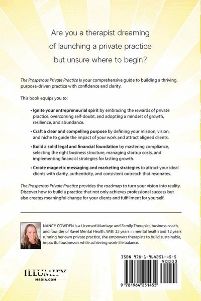 Are you a therapist dreaming of launching a private practice but unsure where to begin? The Prosperous Private Practice is your comprehensive guide to building a thriving, purpose-driven practice with confidence and clarity. This book equips you to: Ignite your entrepreneurial spirit by embracing the rewards of private practice, overcoming self-doubt, and adopting a mindset of growth, resilience, and abundance. Craft a clear and compelling purpose by defining your mission, vision, and niche to guide the impact of your work and attract aligned clients. Build a solid legal and financial foundation by mastering compliance, selecting the right business structure, managing startup costs, and implementing financial strategies for lasting growth. Create magnetic messaging and marketing strategies to attract your ideal clients with clarity, authenticity, and consistent outreach that resonates. The Prosperous Private Practice provides the roadmap to turn your vision into reality. Discover how to build a practice that not only achieves professional success but also creates meaningful change for your clients and fulfillment for yourself.