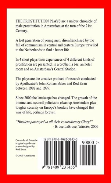 THE PROSTITUTION PLAYS are a unique chronicle of male prostitution in Amsterdam at the turn of the 21st Century. A lost generation of young men, disenfranchised by the fall of communism in central and eastern Europe travelled to the Netherlands to find a better life. In 4 short plays their experiences of 4 different kinds of prostitution are presented: in a brothel; a bar; an hotel room and on Amsterdam's Central Station. The plays are the creative product of research conducted by Aputheatre's John Roman Baker and Rod Evan between 1998 and 1999. Since 2000 the landscape has changed. The growth of the internet and council policies to clean up Amsterdam plus tougher security on Europe's borders have changed this way of life, perhaps forever. "Hustlers portrayed in all their contradictory Glory!" - Bruce LaBruce, Warsaw, 2000