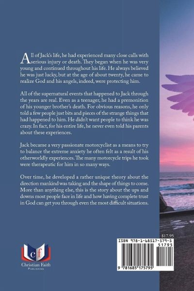 All of Jack's life, he had experienced many close calls with serious injury or death. They began when he was very young and continued throughout his life. He always believed he was just lucky, but at the age of about twenty, he came to realize God and his angels, indeed, were protecting him. All of the supernatural events that happened to Jack through the years are real. Even as a teenager, he had a premonition of his younger brother's death. For obvious reasons, he only told a few people just bits and pieces of the strange things that had happened to him. He didn't want people to think he was crazy. In fact, for his entire life, he never even told his parents about these experiences. Jack became a very passionate motorcyclist as a means to try to balance the extreme anxiety he often felt as a result of his otherworldly experiences. The many motorcycle trips he took were therapeutic for him in so many ways. Over time, he developed a rather unique theory about the direction mankind was taking and the shape of things to come. More than anything else, this is the story about the ups and downs most people face in life and how having complete trust in God can get you through even the most difficult situations.