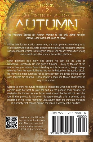 The Protegre Brides: Autumn is a MF alien regency romance with spice and a HEA! The Protegre School for Human Women is the only home Autumn knows...and she's not keen to leave. As the date for her auction draws near, she must go to extreme lengths to stay exactly where she is. After a chance meeting with a handsome stranger, she's confident her place in Protegre is secure. She doesn't realize how wrong she is until she's thrust onto the auction platform. Lovan promises he'll marry and secure his spot as the Duke of Swendshin...eventually. He was given a timeline - marry by the end of the year or lose your estate. Never intending for it to be so soon, things change when he finds the beautiful human woman he bedded on the auction block. He knows he must purchase her to save her from the pirate Stefan. Lovan soon realizes his mistake - he's bought a bride and there's absolutely no way to return her. Getting to know her future husband is impossible when he's never around. Autumn does her best to play her part as the perfect bride despite the obstacles life throws her way. Lovan must accept that he will not marry for love like his parents. Is his love of his estate enough, or is he doomed to be miserable in his forced marriage? Can Autumn learn the intricate workings of a society that doesn't believe her fiancé is worthy of his position?