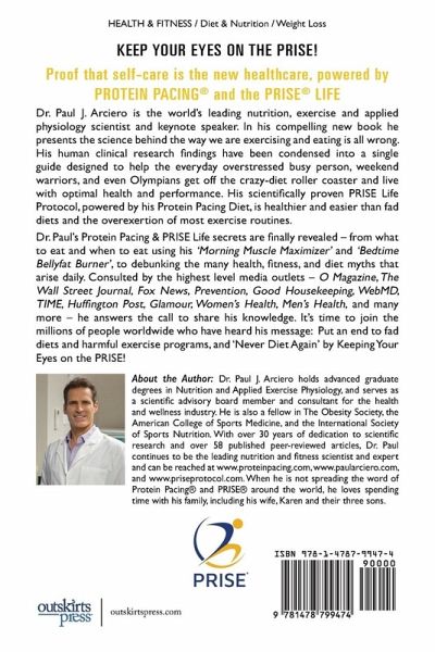 KEEP YOUR EYES ON THE PRISE! Proof that self-care is the new healthcare, powered by PROTEIN PACING® and the PRISE® LIFE Dr. Paul J. Arciero is the world's leading nutrition, exercise and applied physiology scientist and keynote speaker. In his compelling new book he presents the science behind the way we are exercising and eating is all wrong. His human clinical research findings have been condensed into a single guide designed to help the everyday overstressed busy person, weekend warriors, and even Olympians get off the crazy-diet roller coaster and live with optimal health and performance. His scientifically proven PRISE Life Protocol, powered by his Protein Pacing Diet, is healthier and easier than fad diets and the overexertion of most exercise routines. Dr. Paul's Protein Pacing & PRISE Life secrets are finally revealed - from what to eat and when to eat using his 'Morning Muscle Maximizer' and 'Bedtime Bellyfat Burner', to debunking the many health, fitness, and diet myths that arise daily. Consulted by the highest level media outlets - O Magazine, The Wall Street Journal, Fox News, Prevention, Good Housekeeping, WebMD, TIME, Huffington Post, Glamour, Women's Health, Men's Health, and many more - he answers the call to share his knowledge. It's time to join the millions of people worldwide who have heard his message: Put an end to fad diets and harmful exercise programs, and 'Never Diet Again' by Keeping Your Eyes on the PRISE!