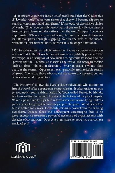 An ancient American Indian chief proclaimed that the God of this world would "curse your riches that they will become slippery to you that you cannot hold onto them." It's an odd, yet descriptive choice of words. When you consider every part of our worldwide economy is based on petroleum and derivatives, then the word "slippery" becomes appropriate. When a car runs out of oil, the motor seizes and disgorges its internal parts through a gaping hole in the side of the motor. Without oil (or the need for it,) our world is no longer functional. 1993 introduced an incredible invention that was a perpetual motion machine. Whether it worked or not was never publicly proven. "The Prototype" is a discussion of how such a thing would be viewed by the "powers that be." Dismal as it seems, the world isn't ready to receive such an abrupt change in direction. Every institution would blow apart at the seams. Oppression, even genocide are inevitable results of greed. There are those who would rise above the devastation, but others who would promote it.fromhose soul purpose is to exert influence and force upon others to achieve their goals. in mankind is that aThere "The Prototype" follows the lives of three individuals who attempt to free the world of its dependence on petroleum. It takes unique talents to accomplish such a thing. Keith De Code, called Dakota by friends, is a hero waiting to happen. He sits at the bottom of his pit of despair. When a poker buddy slips him information just before dying, Dakota pieces everything together and steps up to the plate. What lies before him is better not known. He should certainly cower from the ensuing cataclysm. Dakota faces the consequent catastrophe, but is he good enough to overcome powerful nations and organizations with decades of corruption? Does one man have the power to overcome a world of evil? .