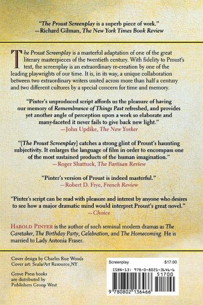 In the early 1970s Harold Pinter joined forces with director Joseph Losey and Proust scholar Barbara Bray to develop a screenplay of Proust's masterpiece, Remembrance of Things Past. Pinter took more than a year to conceive and write the screenplay and called the experience "the best working year of my life." Although never produced, Harold Pinter's The Proust Screenplay is considered one of the greatest adaptations for the cinema ever written. With fidelity to Proust's text, the screenplay is an extraordinary re-creation by one of the leading playwrights of our time. It is, in its way, a unique collaboration between two extraordinary writers united across more than half a century and two different cultures by a special concern for time and memory.