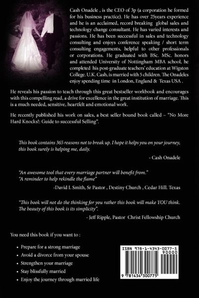 This book is simply revolutionary, the cut is unusual and different. The turn of every page challenges the traditional thinking of marriage . It leaps at you with personal knowledge that makes you perspire. It is riveting from the first to the last page and continues to inspire you until you climax with the cry "this is so real" it reveals untold energy of couples , their relationships and search for peace, security and purpose, which we can all relate to . it contains a barometer to measure where your marriage is at today, for those who wish to assess their marriage. Allowing you to see other areas that require improvement. You need this book if you want to : · Prepare for a strong marriage · Avoid a divorce · Strengthen your marriage · Stay married in peace · Enjoy the journey through married life This book contains 365 reasons not to break up, I hope it helps you on your journey, this book surely is helping me, daily - Cash Onadele