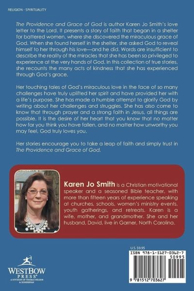 The Providence and Grace of God is author Karen Jo Smith’s love letter to the Lord. It presents a story of faith that began in a shelter for battered women, where she discovered the miraculous grace of God. When she found herself in the shelter, she asked God to reveal himself to her through his love—and he did. Words are insufficient to describe the reality of the miracles that she has been so privileged to experience at the very hands of God. In this collection of true stories, she recounts the many acts of kindness that she has experienced through God’s grace. Her touching tales of God’s miraculous love in the face of so many challenges have truly uplifted her spirit and have provided her with a life’s purpose. She has made a humble attempt to glorify God by writing about her challenges and struggles. She has also come to know that through prayer and a strong faith in Jesus, all things are possible. It is the desire of her heart that you know that no matter how far you think you have fallen, and no matter how unworthy you may feel, God truly loves you. Her stories encourage you to take a leap of faith and simply trust in The Providence and Grace of God.
