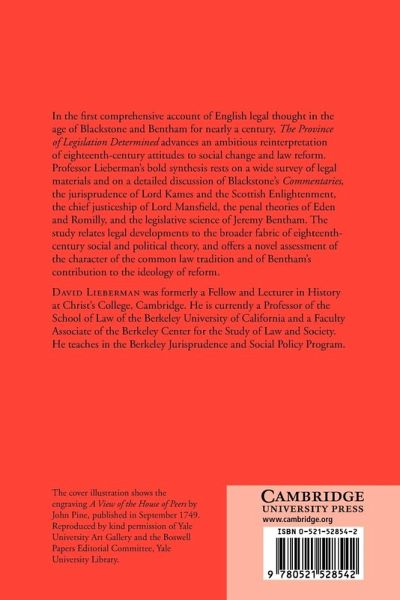 A comprehensive account of English legal thought in the age of Blackstone and Bentham for nearly a century, The Province of Legislation Determined advances an ambitious reinterpretation of eighteenth-century attitudes to social change and law reform. Professor Lieberman's bold synthesis rests on a wide survey of legal materials and on a detailed discussion of Blackstone's Commentaries, the jurisprudence of Lord Kames and the Scottish Enlightenment, the chief justiceship of Lord Mansfield, the penal theories of Eden and Romilly, and the legislative science of Jeremy Bentham. The study relates legal developments to the broader fabric of eighteenth-century social and political theory, and offers a novel assessment of the character of the common law tradition and of Bentham's contribution to the ideology of reform.