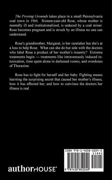 The Proving Grounds takes place in a small Pennsylvania coal town in 1966. Sixteen-year-old Rose, whose mother is mentally ill and institutionalized, is seduced by a coal miner. Rose becomes pregnant and is struck by an illness no one can understand. Rose's grandmother, Margaret, is her caretaker but she's at a loss to help Rose. What can she do but side with the doctors who label Rose a product of her mother's insanity? Extreme treatments begin --- treatments like intravenously induced intoxication, time spent alone in darkened rooms, and overdoses of Thorazine. Rose has to fight for herself and her baby. Fighting means learning the surprising secret that caused her mother's illness, how it has affected her, and how to convince the doctors her illness is real.