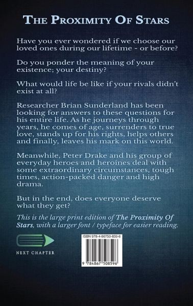 Have you ever wondered if we choose our loved ones during our lifetime - or before? Do you ponder the meaning of your existence; your destiny? What would life be like if your rivals didn't exist at all? Researcher Brian Sunderland has been looking for answers to these questions for his entire life. As he journeys through years, he comes of age, surrenders to true love, stands up for his rights, helps others and finally, leaves his mark on this world. Meanwhile, Peter Drake and his group of everyday heroes and heroines deal with some extraordinary circumstances, tough times, action-packed danger and high drama. But in the end, does everyone deserve what they get? This is the large print edition of The Proximity Of Stars, with a larger font / typeface for easier reading.