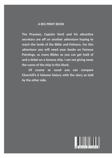 A BIG PRINT BOOK The Prussian, Captain VonS and his attractive secretary are off on another adventure hoping to reach the lands of the Bible and Palmyra. For this adventure you will need your books on Famous Paintings, as many Bibles as you can get hold of and a ticket on a famous ship. I am not giving away the name of the ship in this blurb. Of course as usual you can compare Churchill's 6 Volume history with the story as told by the other side.