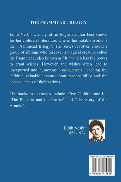 Edith Nesbit was a prolific English author best known for her children's literature. One of her notable works is the "Psammead trilogy". The series revolves around a group of siblings who discover a magical creature called the Psammead, also known as "It," which has the power to grant wishes. However, the wishes often lead to unexpected and humorous consequences, teaching the children valuable lessons about responsibility and the consequences of their actions. The books in the series include "Five Children and It", "The Phoenix and the Carpet" and "The Story of the Amulet".