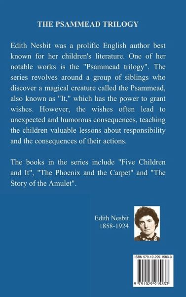Edith Nesbit was a prolific English author best known for her children's literature. One of her notable works is the "Psammead trilogy". The series revolves around a group of siblings who discover a magical creature called the Psammead, also known as "It," which has the power to grant wishes. However, the wishes often lead to unexpected and humorous consequences, teaching the children valuable lessons about responsibility and the consequences of their actions. The books in the series include "Five Children and It", "The Phoenix and the Carpet" and "The Story of the Amulet".